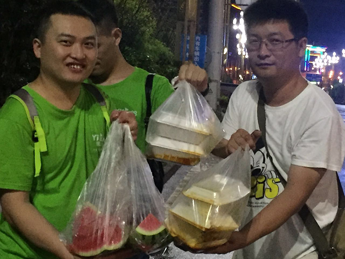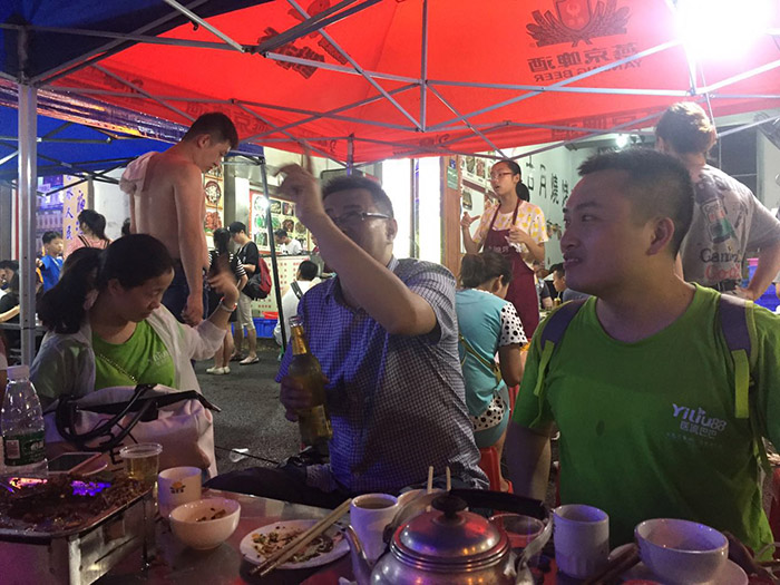 “同志们,人呢?我们在古月烧烤等着,快来呀!”朋友圈里的一声吆喝,20余人在一小时之内陆续汇集于此,约占整个出游人数的三分之一,让人始料不及。只见外摆的桌子接了一张又一张,啤酒要了一箱又一箱……酒过三巡,菜过五味,大家唱着歌儿,提着为没能来的小伙伴打包的宵夜和西瓜,步行回酒店,笔者心中不禁对这个“呼之能来,来之能站,战之必胜”颇具团队精神的团队感到欣慰。